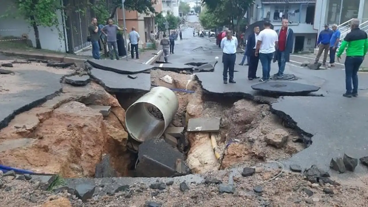 Kocaeli'nin Gebze ilçesinde sabah saatlerinde başlayan kuvvetli yağışın ardından İnönü Mahalllesi Şehit Hamdi Pekçalışkan Caddesi'nde yağmur suyu ve şebeke suyu hatlarının patlaması sonucu yolda çökmemeydana geldi.