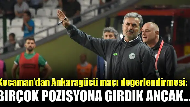 Çok sayıda pozisyona girdiklerini de belirten Aykut Kocaman, "Ortam son derece uygundu bu anlamda. Oyuncular da bunun farkındaydı. Daha birinci dakikadan itibaren oyunun kontrolünü tamamen elimizde tuttuk. Maçın kazanılması adına her türlü gol girişimini sağdan soldan, ceza sahası içerisinden, dışarısından topu hızlılaştırarak maçın büyük bölümünde kaleye geldik. Fakat zaman zaman bir tanesini direk olmak üzere bizim beceri eksikliğimiz zaman zamanda Korcan başta olmak üzere Ankaragücü savunmasının her topa hamle yapması, blok yapması bunları geçen topları Korcan'ın toplamasıyla istediğimizi elde edemedik. Durumla ilgili puan kaybıyla başlamak geçen seneden kalan izlerden dolayı. Çünkü Konya kamuoyunda kuvvetli bir galibiyetlerle ilgili skora ihtiyacı var. Bununda farkındayım. Bunuda bugün çok istiyorduk. Fakat bunu başaramadık. Bu oyunun etrafından dönmeyi başarabilirsek biraz daha altı zaman zaman biraz daha üstü zaman zaman özellikle bizi skora getirecek oyuncular olan şu anda hazır olmadıkları çok net görünen Bajic, Ömer Ali Şahiner ve Milosevic'in henüz yüzde 60-70 seviyesinde olması da bugünkü maçın bizim adımıza skora yansıyamaması açısından etkenlerden bir tanesi oldu" diye konuştu.