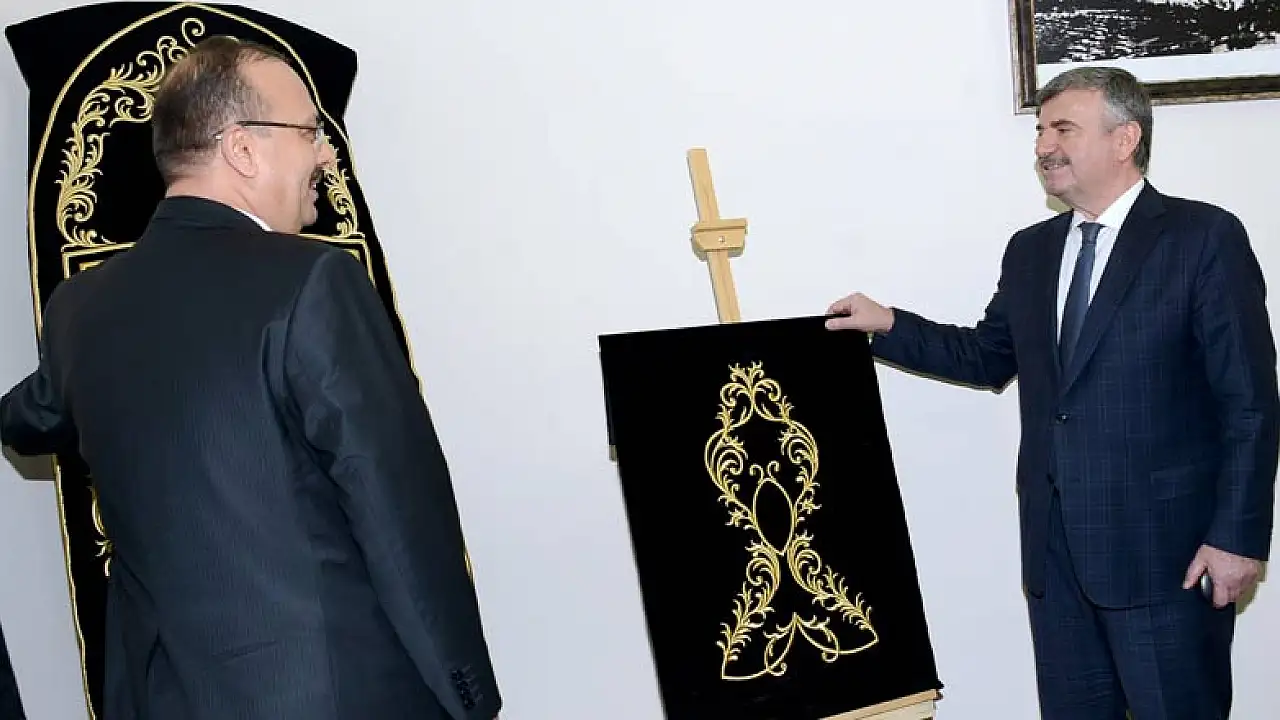 Konya Valisi Yakup Canbolat, Büyükşehir Belediye Başkanı Tahir Akyürek ve İl Müftüsü Prof. Dr. Ali Akpınar, minber örtüsünü inceleyerek hayırlı olmasını diledi.