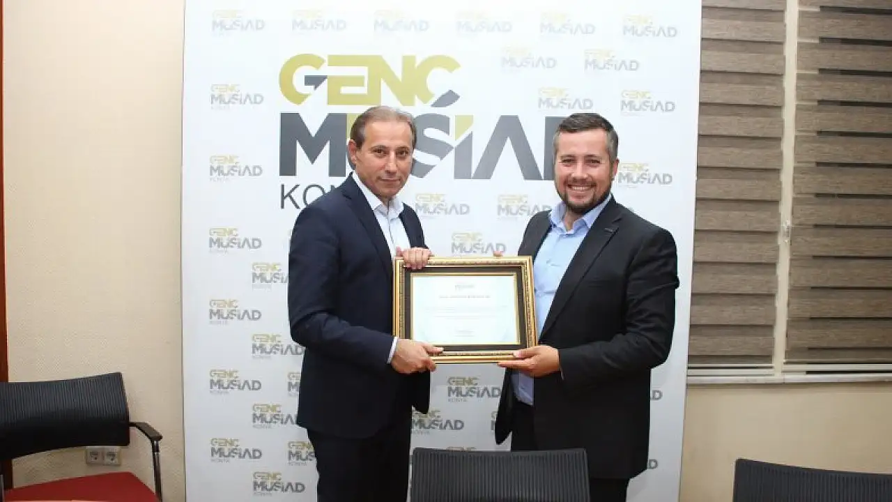 Programın sonunda Genç MÜSİAD Konya Şube Başkanı Kadir Başaran, Esnaf ve Sanatkârlar Odaları Birliği Başkanı Muharrem Karabacak’a hediye takdim etti.