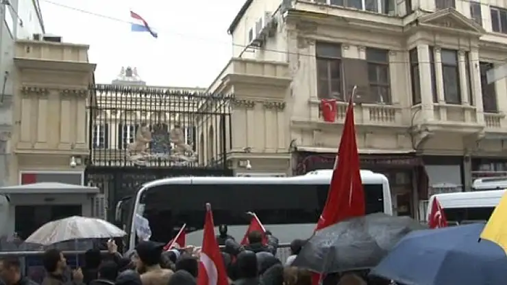 Hollanda ile yaşanan diplomasi krizine tepki gösteren vatandaşların Hollanda Başkonsolosluğu önündeki bekleyişi devam ediyor. Dün akşam saatlerinden itibaren ellerinde Türk bayraklarıyla konsolosluk önüne gelen vatandaşların protestosu sürüyor. Yağmura aldırış etmeyen vatandaşlar sloganlar atarak tepkilerini dile getiriyor.
