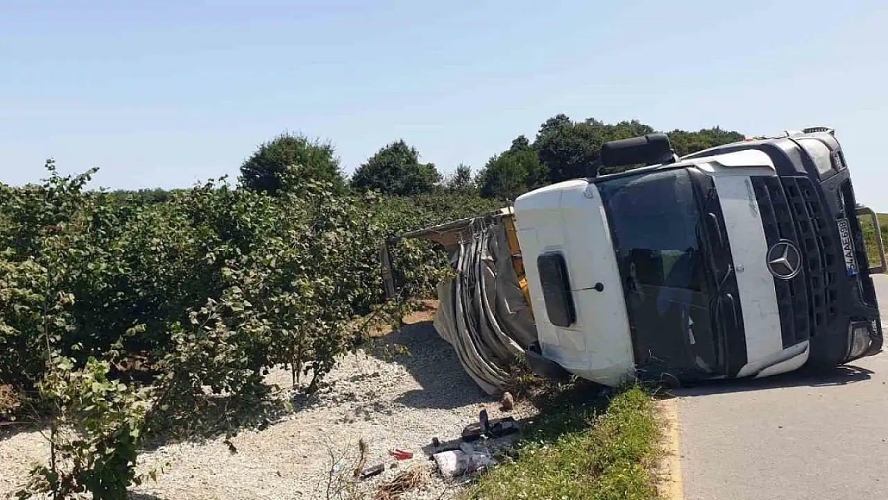 Sakarya'nın Kaynarca ilçesinde sürücüsünün kontrolünden çıkan kamyon devrildi.