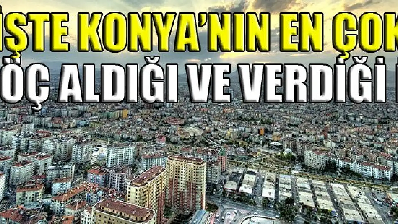 Konya’nın en çok göç verdiği iller ise sırasıyla; Ankara (7.765 kişi), İstanbul (6.004 kişi), Antalya (5.161 kişi), İzmir (2.813 kişi), Karaman (2.098 kişi), en az göç verdiği iller ise sırasıyla Tunceli (61 kişi), Ardahan (61 kişi), Bayburt (76 kişi), Bartın (78 kişi), Kilis (79 kişi) oldu.