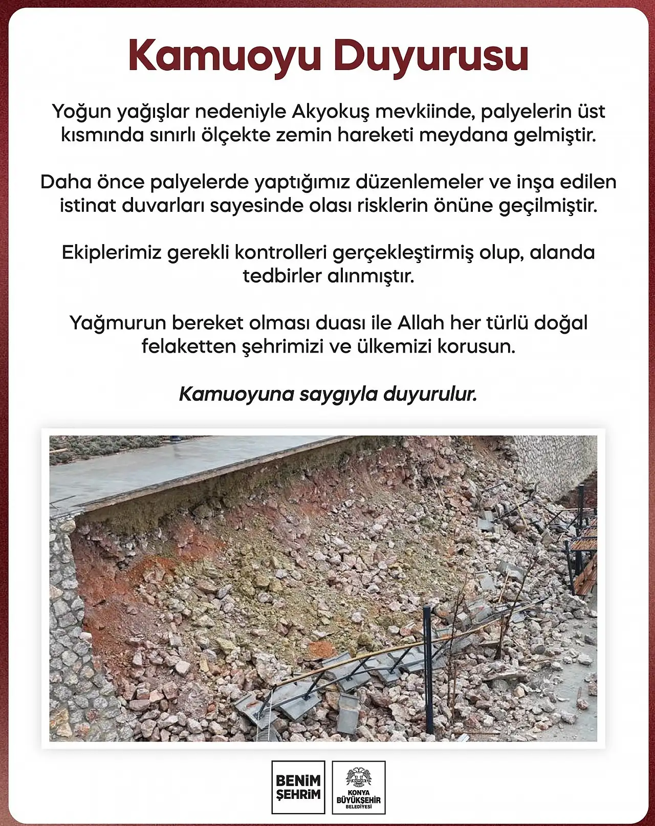 Konya Akyokuş'ta yoğun yağışlar nedeniyle palyelerin üst kısmında sınırlı ölçekte zemin hareketi meydana geldiği duyuruldu. Konu ile ilgili yapılan açıklamada gerekli tedbirlerin alındığı ifade edildi.