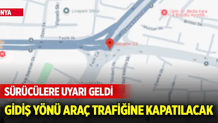 Konya'da sürücüleri ilgilendiren duyuru... Beyşehir Caddesi üzerinde bakım-onarım çalışması gerçekleştirilecek. Konya AKOM'dan yapılan duyuruyor göre açıklanan saatlerde Beyşehir'e gidiş yolu trafiğe kapatılacak.