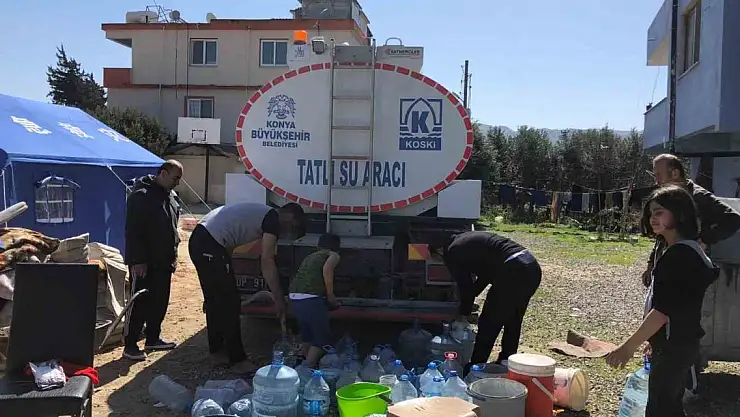 Konya Büyükşehir Belediyesi, depremin yaralarını sarmak için ilk günden beri çalıştığı Hatay'da yürüttüğü altyapı çalışmalarının yanında şebekenin olmadığı alanlara tatlı su tankerleri ile su hizmeti götürüyor.