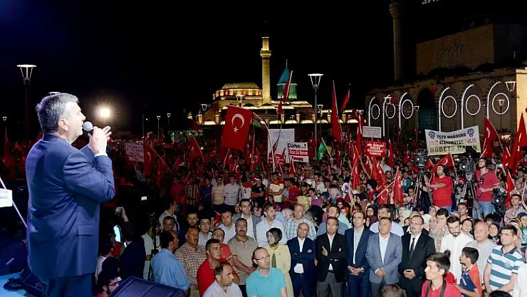 Programda konuşan Konya Büyükşehir Belediye Başkanı Tahir Akyürek, Mevlana Meydanı’nın 6 akşamdır dolup taştığını ve halkın birlik mesaj verdiğini belirterek, “15 Temmuz’dan bu akşama halkımız diyor ki; artık biz milli iradeye ortak koşmayacağız. Artık darbelere boyun eğmeyeceğiz. Artık zalimlere, kan dökücülere, katillere hayır diyoruz. Türkiye, sadece Konya’da değil 81 vilayette tek yürek oldu, tek yumruk oldu ve darbelere hayır dedi. Belki Türk tarihinde ilk defa meydanlarla, insanımızla, milletimiz kendi canını ortaya koyarak bir darbeyi durdurdu, sonuçsuz bıraktı. Türk Silahlı Kuvvetlerimizin darbeye hayır diyen şanlı mensuplarını da tebrik ediyoruz. Yine Emniyet teşkilatımız, devlete bağlı askerlerimizle birlikte canını ortaya koyarak günlerce büyük bir mücadele verdi. Kahraman polisimize ve günlerdir bütün koordinasyonda hiç uyku uyumadan çok önemli bir millet hizmeti yerine getiren Sayın Valimize teşekkür ediyoruz. Bugünleri hiçbir zaman unutmayın. Kendi hayatınızda en önemli nöbetler, en önemli duruşlar tarihe ibret levhası olarak ve kendi hayatınızın tarihine ibret levhası olarak asılacak. Ömür boyu bu duruş nedeniyle çocuklarınıza, insanımıza bu hatırayı anlatacaksınız” diye konuştu.