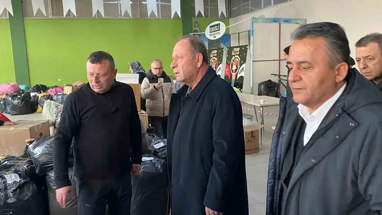 Konya'nın Ereğli ilçesinde İlçe Kaymakamı Edip Çakıcı, Ereğli Belediye Başkanı Hüseyin Oprukçu, ilçe belediyesi tarafından deprem bölgelerine gönderilmek için organize edilen Belediye Kültür Merkezindeki yardım toplama alanını ziyaret ederek incelemelerde bulundu.