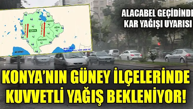 Yapılan son değerlendirmelere göre; bugün beklenen sağanak yağışların Konya'nın güney ilçelerinde (Seydişehir, Akören, Derebucak, Yalıhöyük, Ahırlı, Bozkır, Güneysınır, Hadim ve Taşkent) yer yer çok kuvvetli (50-80 kg/m2) olması bekleniyor. Yağışların Alacabel geçidi başta olmak üzere 1500 m üzeri yüksek kesimlerde yoğun kar yağışı şeklinde olacağı tahmin ediliyor. Kuvvetli yağışlarla birlikte sel, su baskını, ulaşımda aksamalar gibi olumsuzluklara karşı dikkatli ve tedbirli olunmalıdır.