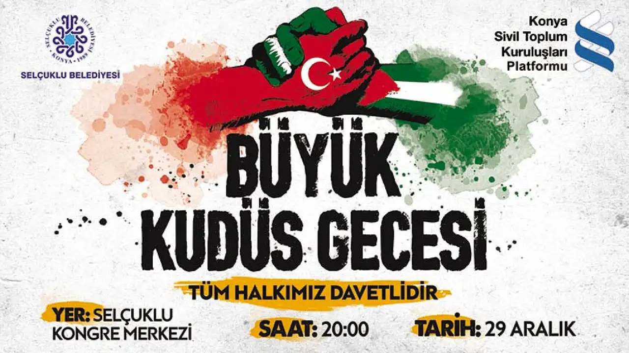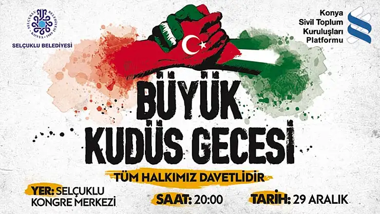Selçuklu Belediyesi ve Sivil Toplum Kuruluşları Platformu işbirliğinde 29 Aralık Cuma Günü saat 20:00’de Selçuklu Kongre Merkezi’nde “Büyük Kudüs Gecesi” programı düzenlenecek. Gecede Amerika’nın Kudüs’ü başkent tanıma çabaları ve İsrail’in Filistin topraklarında uyguladığı devlet terörü yeniden telin edilecek. Grup Genç, Sanatçı Ömer Karaoğlu ve Tarihçi Yazar Yavuz Bahadıroğlu'nun katılacağı gecede Filistin filmi ve Sultan Abdülhamid'in canlandırıldığı kısa bir gösteri de yer alacak.