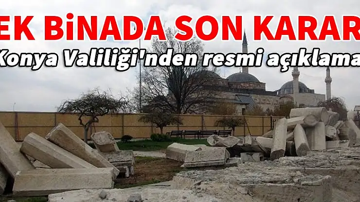 Konya Kültür Varlıklarını Koruma Bölge Kurulu 16.06.2017 tarihinde, Kültür ve Turizm Bakanlığının 02.06.2017 tarihli E.111896 sayılı yazısı doğrultusunda; müze ek binası projesinin uygulanamayacağından hareket ile inşâi uygulamasının sonlandırılmasına, projenin sosyal donatı WC bölümünün ( projesinin Bakanlık onayı sonrasında) aynı (eski) yerine uygulanmasının devam edebileceğine (inşa edilmesine) karar verilmiştir.