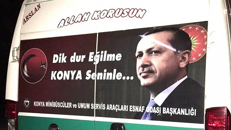 Konya, Cumhurbaşkanı Recep Tayyip Erdoğan’ı karşılamaya hazırlanıyor. Konya Minibüsçüler ve Umum Servis Araçları Esnaf Odası da Cumhurbaşkanı Erdoğan’ın Konya gelişi münasebeti ile minibüslerin arka panellerini Cumhurbaşkanı Erdoğan'ın sözleri donattı. Konya Minibüsçüler ve Umum Servis Araçları Esnaf Odası yaptığı bu davranışla kamuoyunda takdir topluyor. Konya’da hizmet veren minibüsçülerin 15 Temmuz akşamı gerçekleştirilen ve ülkeyi kana bulayan darbe girişimine biran olsun sessiz kalmadığını ifade eden Konya Minibüsçüler ve Umum Servis Araçları Esnaf Odası Başkanı Muharrem Karabacak, Konya Minibüsçüler ve Umum Servis Araçları Esnaf Odası olarak farklı bir çalışmaya imza attıklarını söyledi.