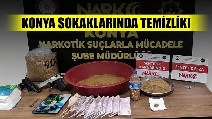 Konya'da Narkotik ekipleri temizliğe devam ediyor. Ekipler, gençleri zehirlemek için piyasaya uyuşturucu süren ve torbacı olarak tabir edilen sokak satıcılarına göz açtırmıyor. Konya'nın merkez ilçelerinde Narkotik Şube ekiplerince 4 adrese yapılan baskında çok sayıda uyuşturucu madde ele geçirilirken 7 şahıs gözaltına alındı.