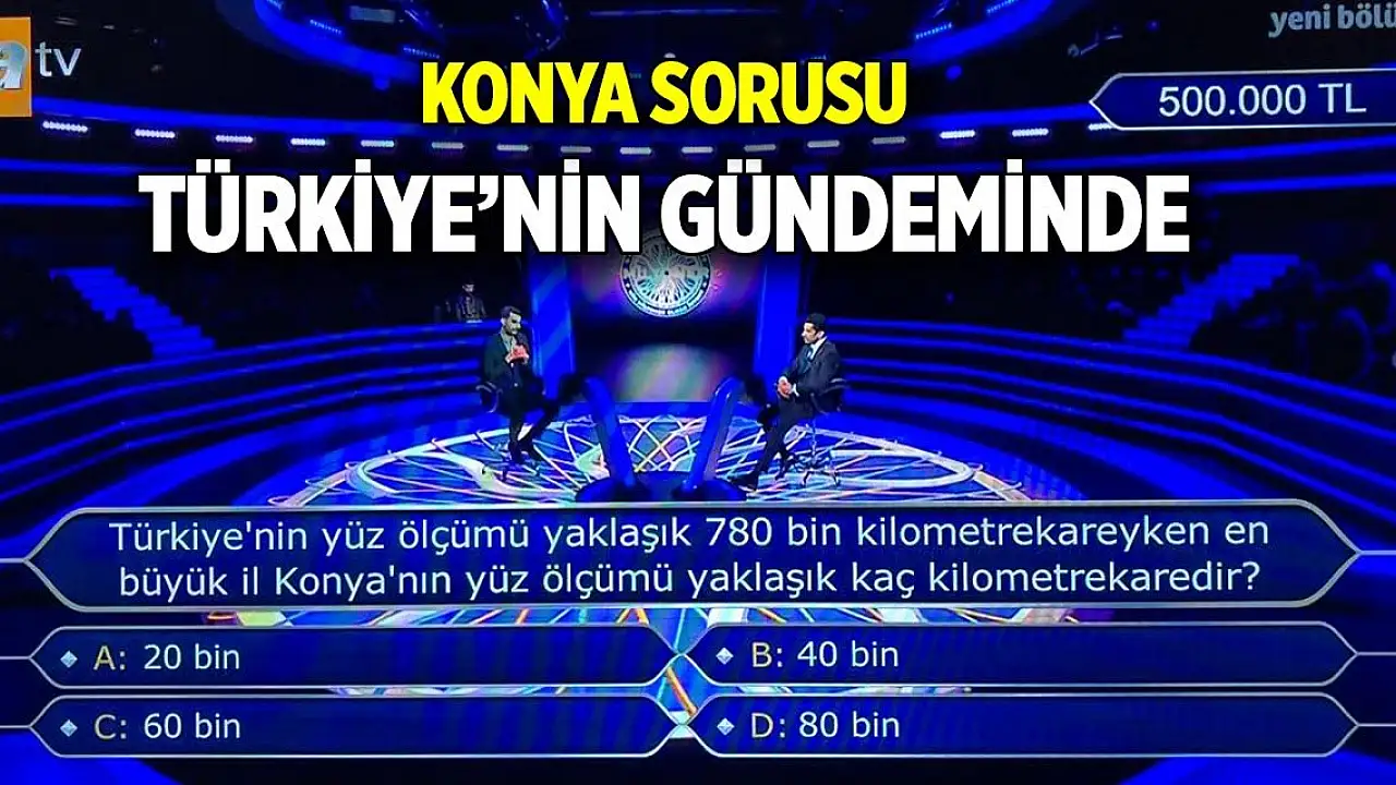 Kim Milyoner Olmak İster'de işte 500 bin liralık soru ve cevabı Türkiye’nin gündemine oturdu. Milyoner sorusu: 500 bin liralık soru: Türkiye'nin yüz ölçümü yaklaşık 780 bin kilometrekareyken en büyük il Konya'nın yüzölçümü yaklaşık kaç kilometrekaredir?? Kim Milyoner uzun bir aradan sonra 18 Şubat 2024 Pazar günü başlayan Kim Milyoner Olmak Yusuf İpek'e sorulan 500 bin liralık yarışma sorusu ve cevabı.