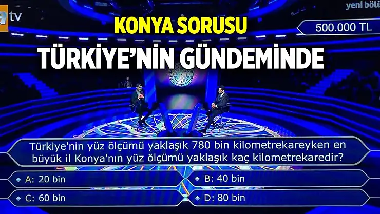 Milyoner sorusu: 500 bin liralık soru: Türkiye'nin yüz ölçümü yaklaşık 780 bin kilometrekareyken en büyük il Konya'nın yüzölçümü yaklaşık kaç kilometrekaredir?