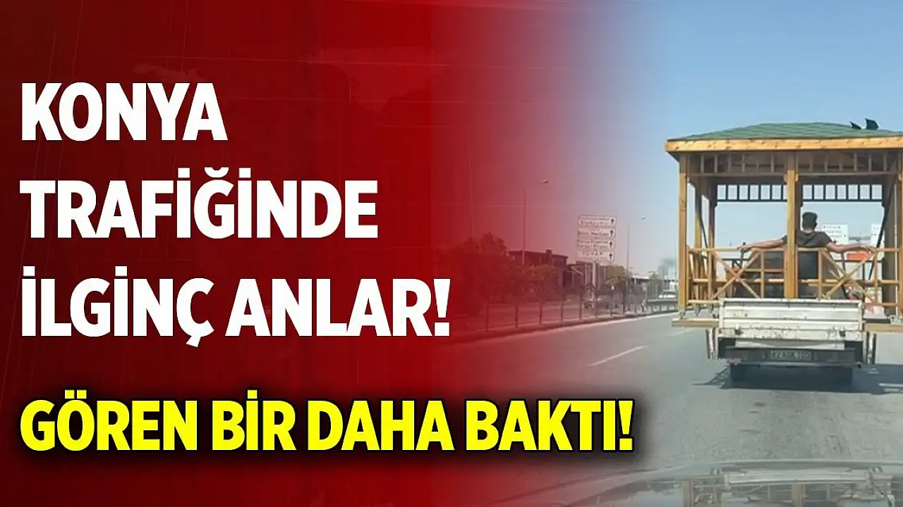 Konya'da trafikte seyreden bir kamyonetin kasasında taşınan kamelyada oturan vatandaş, ilginç görüntüler oluşturdu.