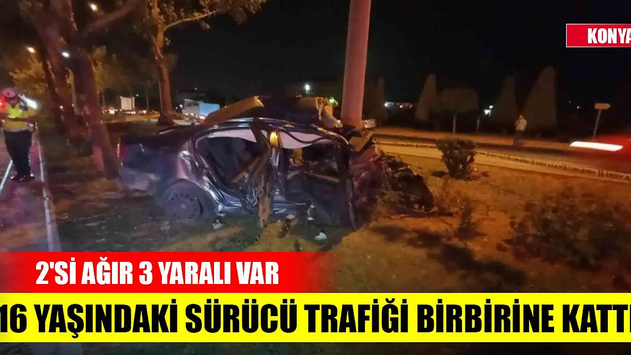 Konya'da 16 yaşında direksiyona geçerek makas atarak ilerleyen otomobil sürücüsünün direksiyon hakimiyetini kaybetmesi sonucu otomobil ağaca çarptı. Çarpmanın etkisiyle araç hurdaya dönerken, 2'si ağır 3 kişi yaralandı.