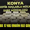 konya Emniyet Müdürlüğü Ekipleri, gençleri zehirlemek için uyuşturucu sevkiyatı yapan zehir tacirlerine büyük darbe vurdu. Yapılan yol uygulamasında durdurulan 3 araçta yaklaşık 17 Kg. Eroin Maddesi ele geçirilirken 5 Kişi gözaltına alındı.