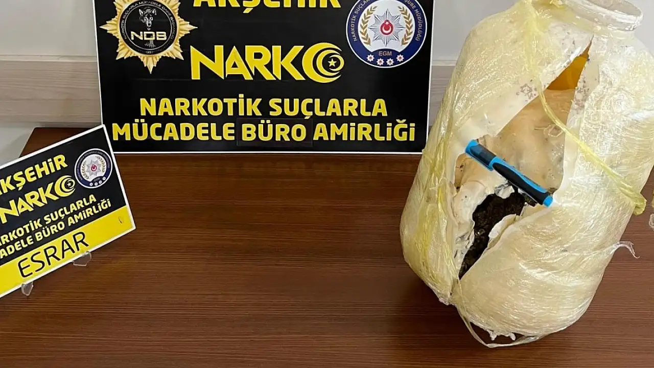 Edinilen bilgiye göre, Akşehir Narkotik ile Konya Narkotik Suçlarla Mücadele Şube Müdürlüğü ekipleri, çevre illerden ilçeye uyuşturucu getirileceği belirlenen aracı takibe aldı. Araç D-300 Karayolu üzerinde polis ekipleri tarafından durdurulurken, araçta bulunan S.A. gözaltına alındı. Gözaltına alınan şüphelinin üzerinde ve eşyalarında arama yapan ekipler, şüphelinin valizinde turşu bidonu içerisine gizlenmiş piyasa değeri yaklaşık 1.5 milyon lira olan 2 kilo750 gram esrar ele geçirdi. S.A. hakkında "uyuşturucu madde bulundurmak, kullanmak, kabul etmek ve uyuşturucu madde ticareti yapmak" suçundan işlem yapıldı. Şüpheli, emniyetteki işlemlerin ardından çıkarıldığı mahkemece tutuklanarak cezaevine gönderildi.