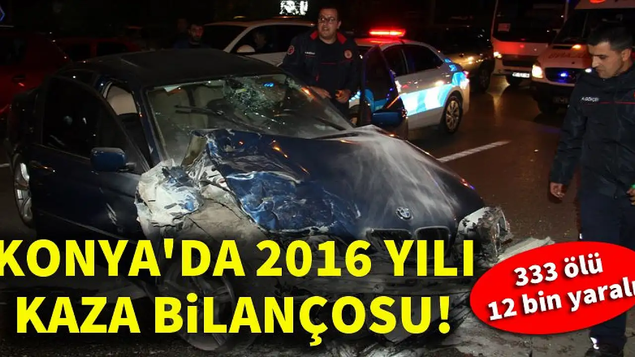 Konya’da 2016 yılında ölümlü yaralanmalı trafik kazalarında toplam 333 kişi ölürken 12 363 kişi yaralandı. Konya ili ölü sayısında Türkiye genelinde İzmir İli ile birlikte 3’üncü sırada yer alırken, yaralanma sayısında 4’üncü sırada yer aldı. Ölümlerin %44,1’i kaza yerinde gerçekleşirken, %55,9’u kaza sonrasında gerçekleşti.