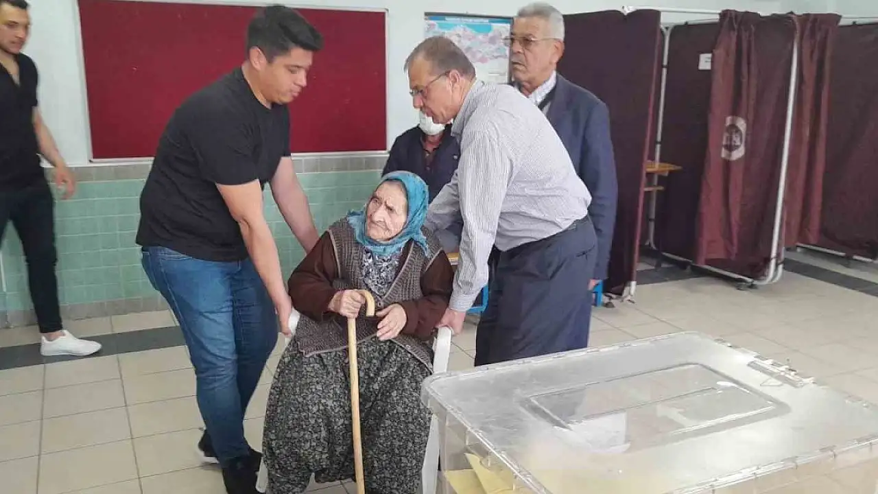 Konya'nın Karapınar ilçesinde 99 yaşındaki Zahide Balıkçı, arabayla getirildiği okulda sandalyeye oturtulup taşınarak bağlı olduğu sandıkta oy kullandı.