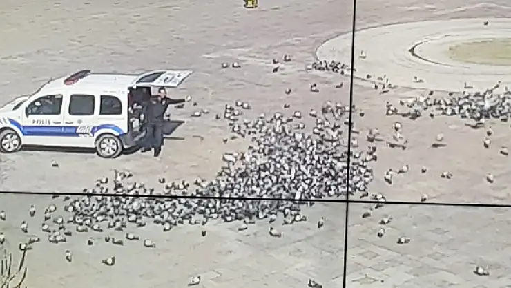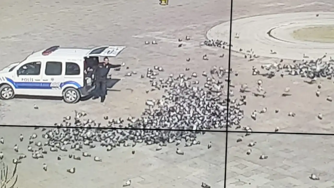 Hükümet Meydanında her gün çevre esnafı ve vatandaşların beslediği güvercinler, korona virüsle mücadele kapsamında hafta sonu sokağa çıkma yasağı ilan edilince aç kaldı. Meydandaki havuz etrafından toplanan güvercinlerin yem aradığını fark eden bölgede görevli polis ekibi yem bularak hayvanları besledi. Polis aracının etrafından toplanan kuşlar verilen yemi yerken bu anlar şehir kameralarına yansıdı.