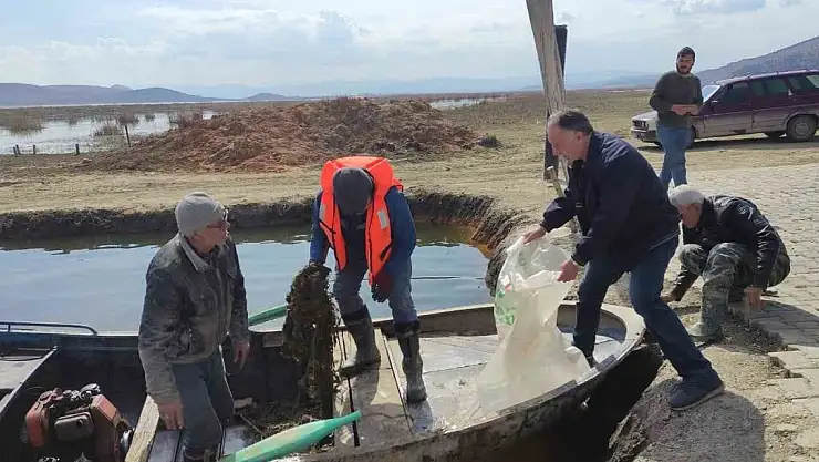 Konya'nın Beyşehir ve Ilgın ilçelerinde, su ürünleri av yasağına rağmen göl sularına kaçak avlanmak amacıyla serilen balıkçı ağları ve pinterler toplanıyor.