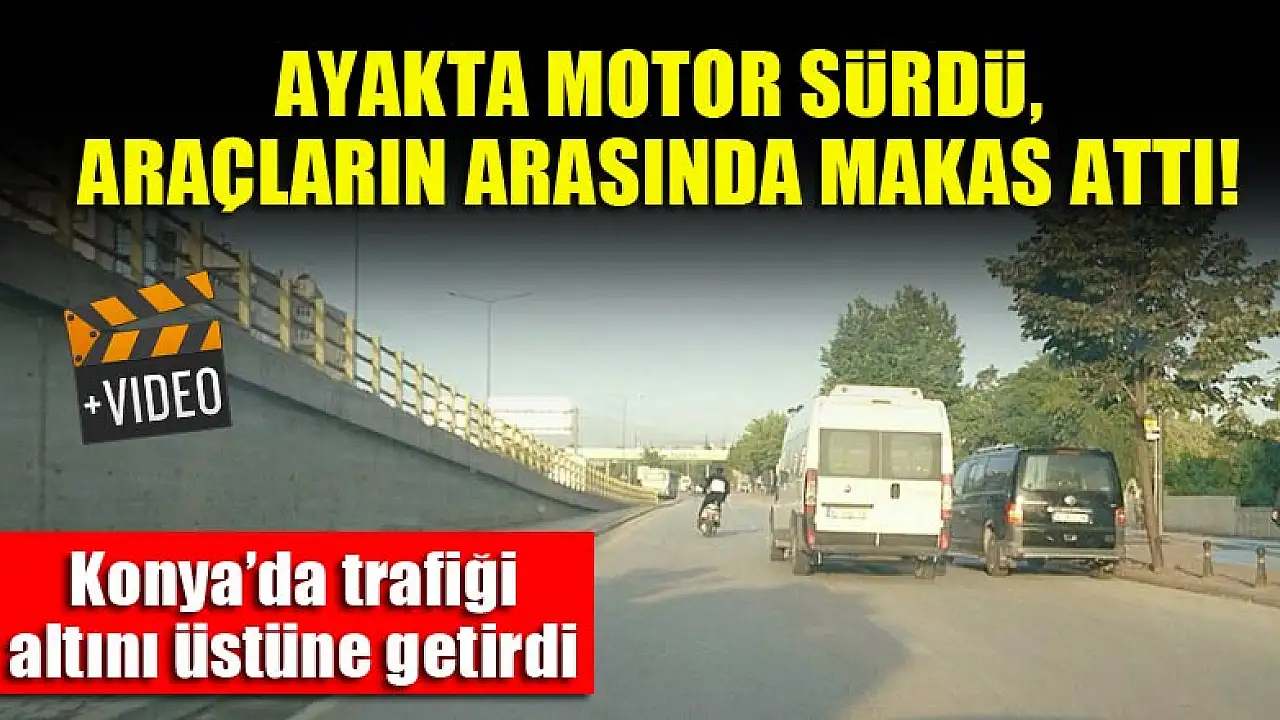 Konya'da sabah saatlerinde trafiğin en yoğun olduğu sıralarda trafikte seyir eden motosikletli gencin hem ayağa kalkması hem de araçların arasına makas atarak girmesi olası bir kazaya davetiye çıkarttı