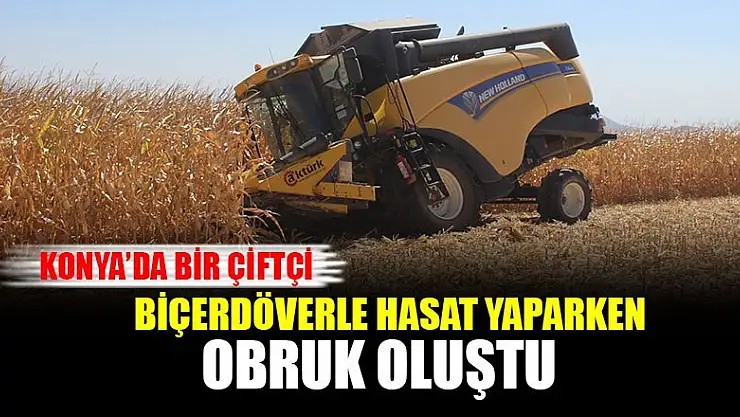 Konya'nın Karapınar ilçesindeki mısır tarlasında hasat yapan operatörün kullandığı biçerdöverin sağ ön tekeri, aniden oluşan 2 metre çapına, 8 metre derinliğindeki obruğun içinde kaldı