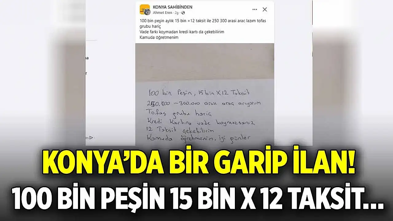 Konya'da bir sosyal medya sitesinde öğretmen olduğunu belirten bir şahıs, '100 bin peşin 15 bin x 12 taksit ile 250 300 bin arası araç arıyorum' ilanı gündem oldu