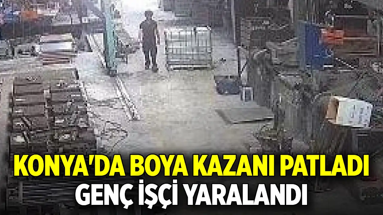 KONYA'da Hakan Filiz (24), çalıştığı metal fabrikasında kazandaki boyayı mikserle karıştırırken meydana gelen patlamada yaralandı. Vücudunda yanıklar oluşan Filiz tedaviye alınırken, patlama güvenlik kamerasına yansıdı.