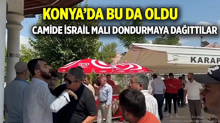 Konya'da bir camide Cuma çıkışı İsrail destekçisi firmanın dondurması dağıtıldı. İsrail malı dondurma dağıtılmasına tepki gösteren bazı vatandaşlar ise yine cami cemaati tarafından tepki gösterilerek alandan uzaklaştırıldı.