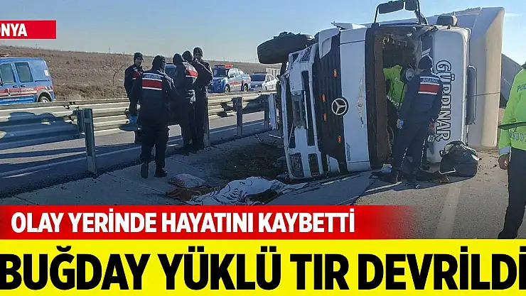 Konya'da kontrolden çıkan buğday yüklü tır devrildi. Kazada Kazada kamyon sürücüsü E.G. yaralanırken, yanında yolcu olarak bulunan amcasının oğlu Yusuf Gürpınar (59) olay yerinde hayatını kaybetti.