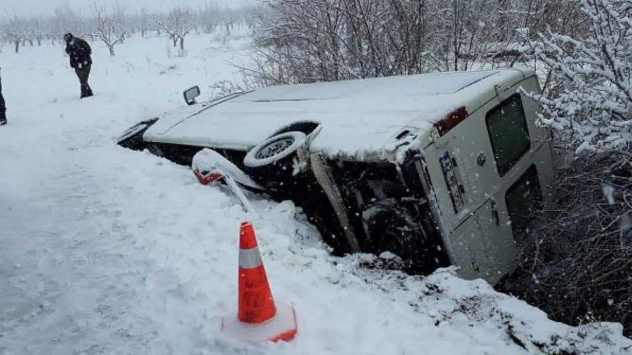 KONYA'da, kar yağışı ve buzlanma nedeniyle sürücüsünün kontrolünden çıkan yolcu minibüsünün devrildiği kazada, 11 kişi yaralandı.