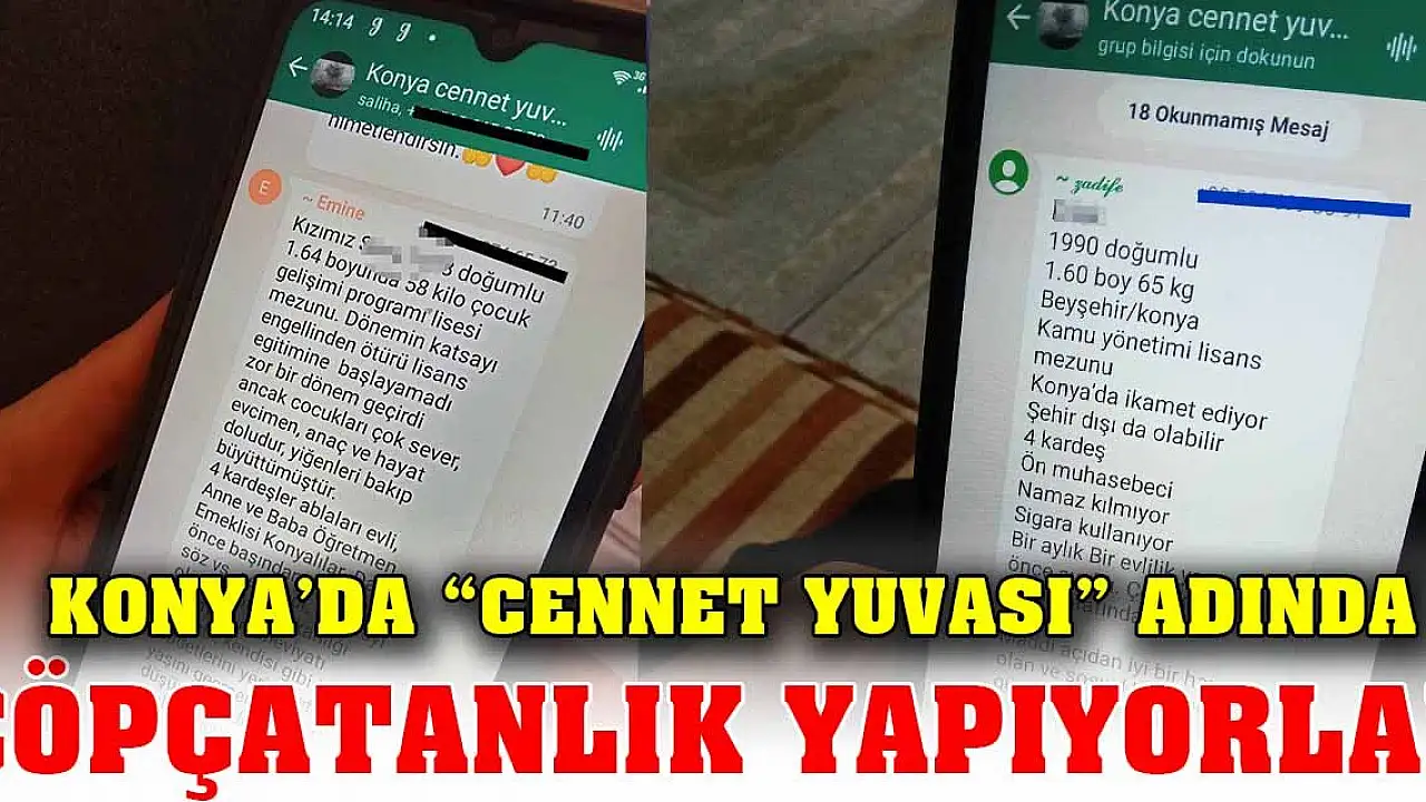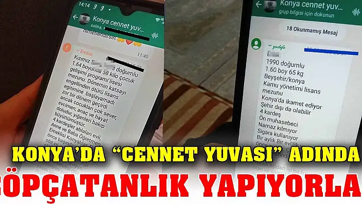 Konya’da olduğu iddia edilen “Konya Cennet Yuvası” isimli whatsapp grubunda genç kadınların eş bulması için özel bilgileri paylaşıldı. Grupta genç ve yetişkin kadınların da özel bilgisi paylaşılırken aranan eş adaylarının özellikleri sıralandı. Whatsapp grubundaki görüntülerin sosyal medyaya düşmesinin ardından görüntüler gündem oldu.