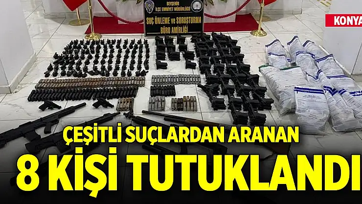 Konya'nın Beyşehir ilçesinde çeşitli suçlardan aranan ve polis tarafından yakalanan 14 şahıstan 8'i tutuklandı. Silah kaçakçılığına yönelik çalışmalarda ise, çok sayıda silah ve silah malzemeleri ele geçirildi.