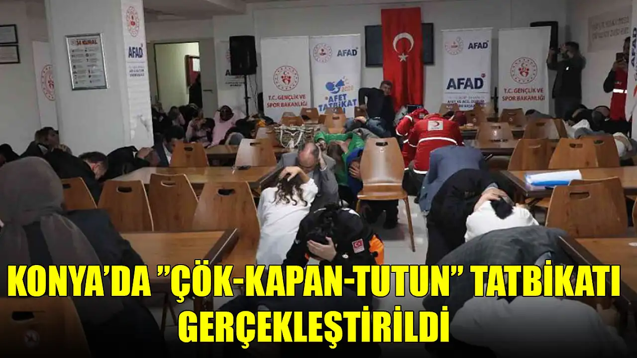 Kredi Yurtlar Kurumu (KYK) Konya Kız Öğrenci Yurdunda Vali Vahdettin Özkan'ın katılımıyla Çök-Kapan-Tutun tatbikatı yapıldı. Deprem anını canlandırmak için senaryo gereği çalınan sirenle başlayan tatbikatta, deprem sırasında hayati öneme sahip olan çök-kapan-tutun pozisyonu alındı.