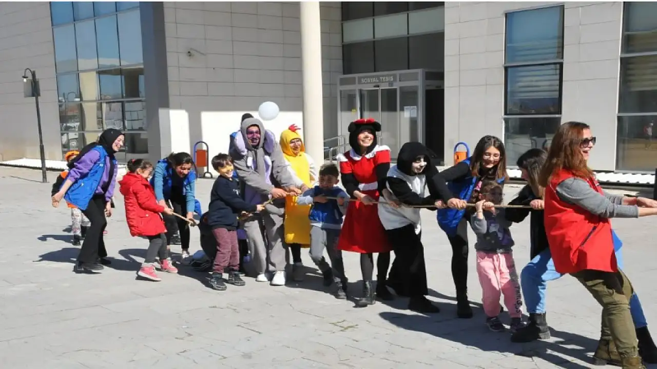 Yüz boyama, çuval yarışı, halat çekme, matrak oyunu, dart gibi oyunlarla neşeli dakikalar geçiren çocuklar çalan müziklerle oyunlar oynayıp, dans etti.