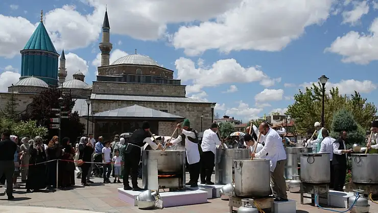 Konya'da, Hazreti Mevlana'nın dergahında Mevlevi usullerine göre pişirilen aşure, vatandaşlara dağıtıldı. Unutulmaya yüz tutan ve 97 yıl sonra 2019'da yeniden başlatılan aşure kaynatma merasimini, Mevlana Müzesi'ni ziyarete gelen yerli ve yabancı turistler ilgiyle izledi.