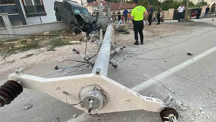Konya'nın Kulu ilçesinde elektrik direğine çarparak direği deviren pikap apartmanın bahçe duvarında asılı kalırken, sürücü yaralandı.