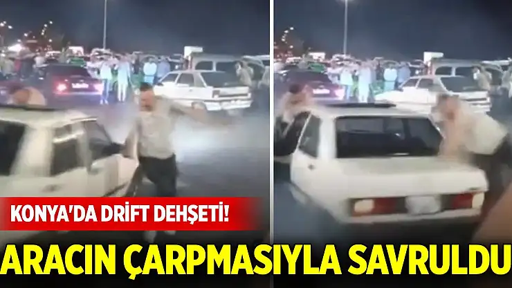 Konya'da bir sürücü otomobil ile kalabalığın arasında drift attığı sırada 2 kişi aracın kaputuna oturdu. Bir süre sonra hareket halindeki araçtan düşen kişiye aracın tamponu çarparak savurdu. Bu anlar ise cep telefonu kameralarına saniye saniye yansıdı.