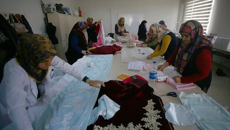 Konya'nın Karapınar ilçesinde yaşayan 70 ev hanımı, Konya Büyükşehir Belediyesi Meslek Edindirme Kursları'nda (KOMEK) aldığı eğitimle mefruşat ve çeyizlik ürünler yapıyor.