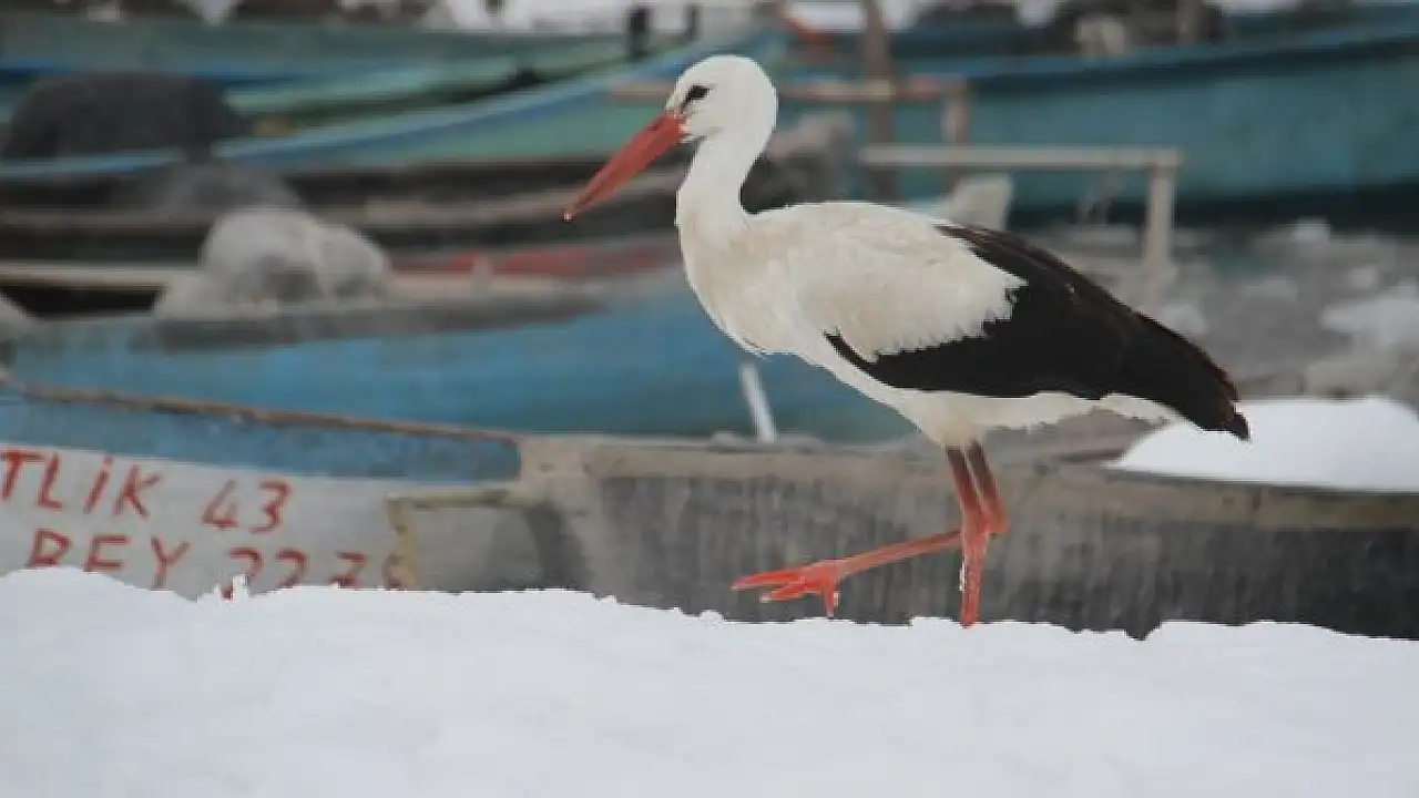 Kıyı kesimleri donan Beyşehir Gölü'nün buz tabakası üzerine de çıkan leylek, bölgede faaliyet gösteren balıkçıların av dönüşü teknesini bekliyor.