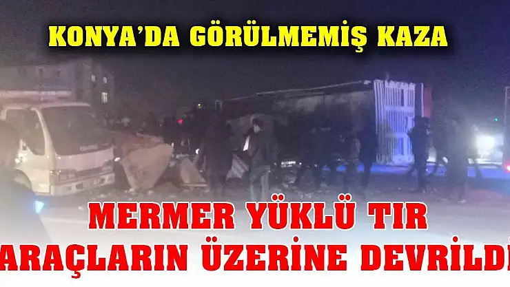 Konya'da Antalya çevre yolunda mermer yüklü tır, ışıklarda bekleyen araçların üzerine devrildi. Kazada 5 kişi yaralandı.