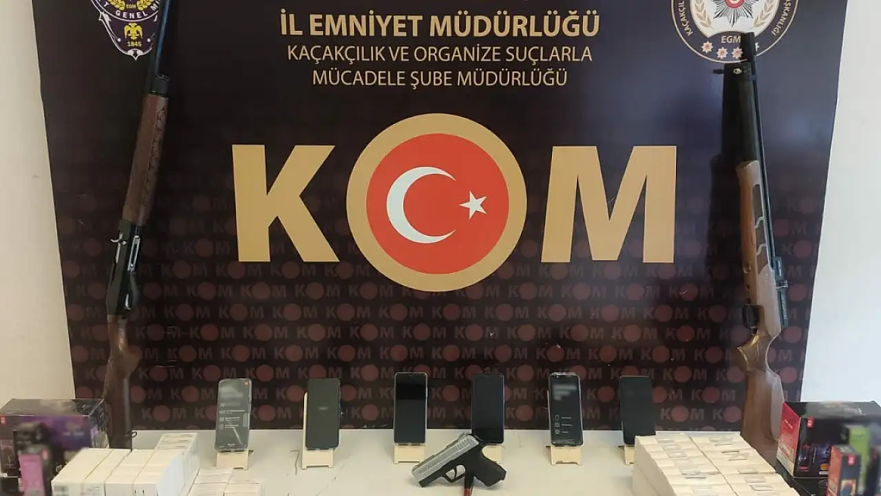Bir iş yeri, ikamet ve araçta yapılan aramalarda 25 adet gümrük kaçağı cep telefonu, 67 adet cep telefonu aksesuarı, 63 adet elektronik nargile, 1 adet kurusıkı tabanca, 2 adet ruhsatsız tüfek, 32 adet av tüfeği fişeği ele geçirildi.