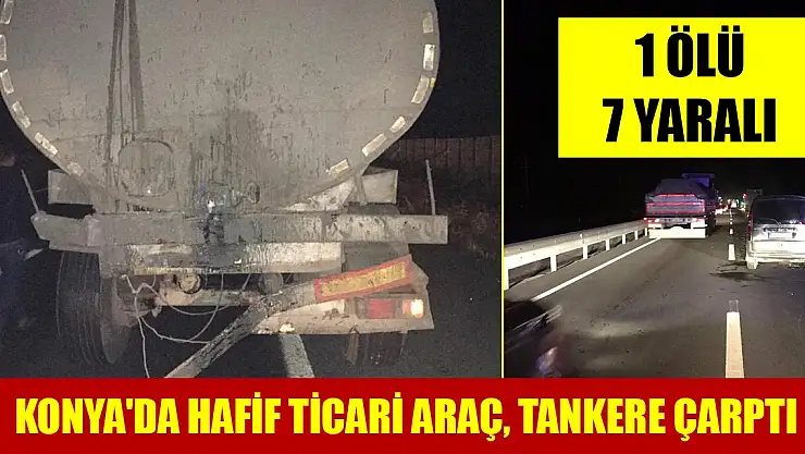 Konya'nın Ereğli ilçesinde, hafif ticari aracın tankere arkadan çarpması sonucu meydana gelen kazada 1 kişi hayatını kaybetti, 7 kişi de yaralandı.