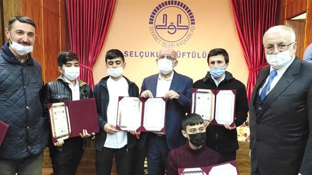 Selçuklu İlçe Müftülüğüne bağlı Kur'an kurslarında hafızlığını tamamlayarak Diyanet İşleri Başkanlığı tarafından gerçekleştirilen 2020 yılı 3. dönem hafızlık sınavlarında başarılı olan hafızlara, düzenlenen törenle belgeleri takdim edildi.