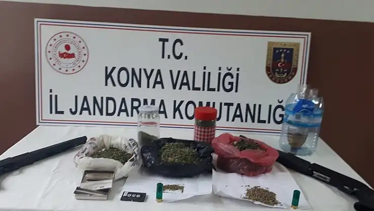Konya'nın Çumra ilçesinde bir kahvehane ve evde yapılan aramada uyuşturucu maddeler ile ruhsatsız silahlar ele geçirildi.