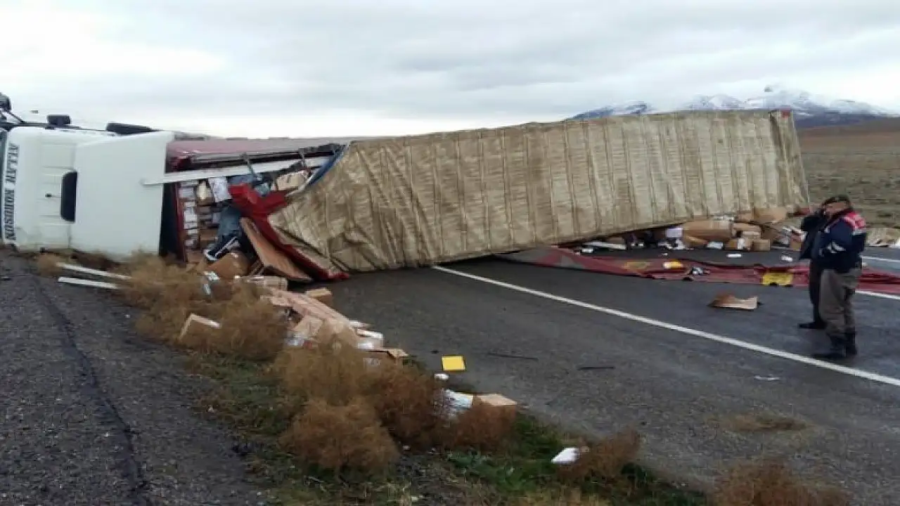 Karapınar’da kargo aracının devrilmesi sonucu taşıdığı eşyalar yola saçıldı.