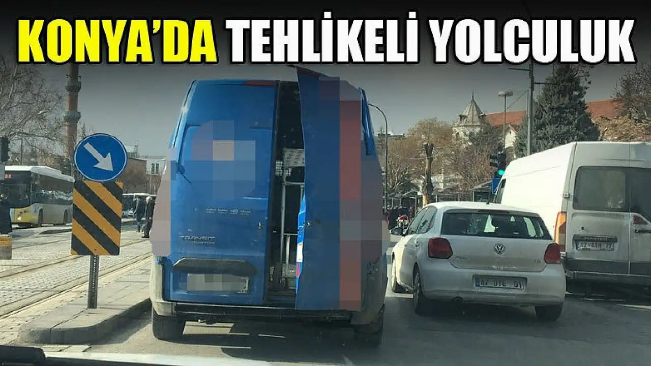 KONYA'da, kargo firmasına ait minibüs, arka kapısı açık olarak trafikte seyrederken görüntülendi.
